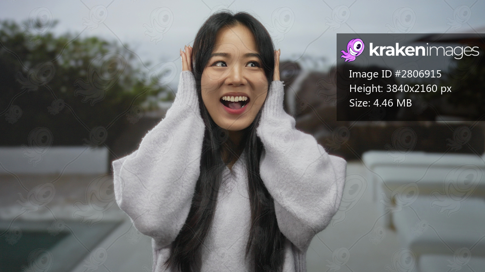 Woman smiling outdoors, showcasing joyful expression with long hair and casual sweater, set against lush greenery and soft lighting for a vibrant outdoor scene capture. - Kraken Images