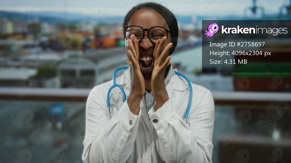 Woman smiling outdoors with stethoscope by seaside port, combining elements of healthcare and maritime setting with a cheerful expression in bright, natural light. - Kraken Images
