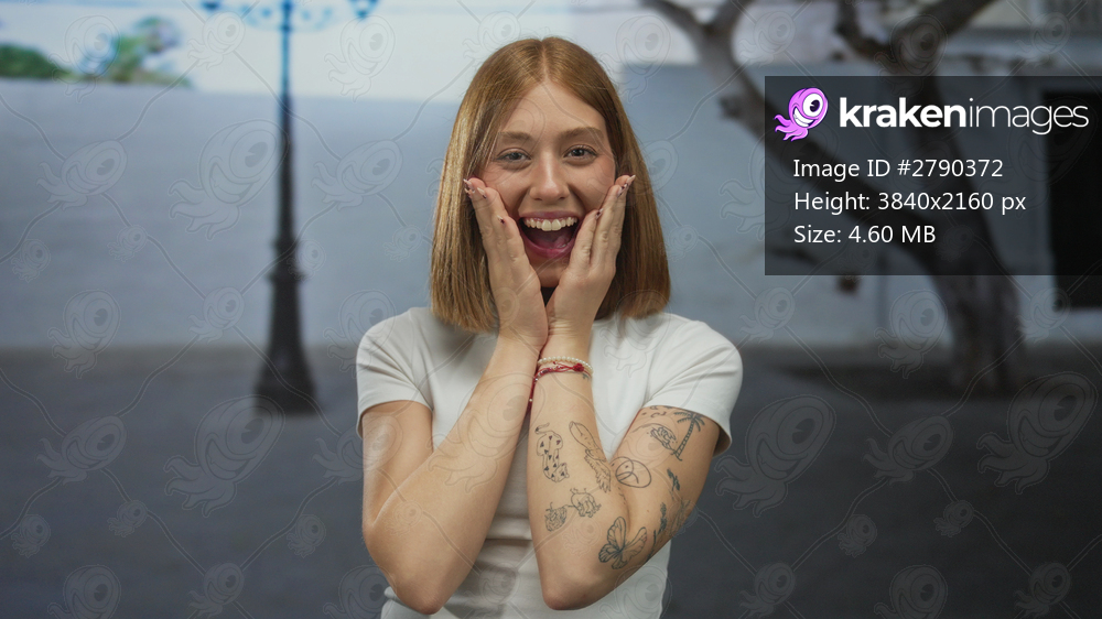 Woman smiling outdoors with tattoos in an urban setting wearing a white shirt and bracelets, against a backdrop of a street lamp and trees.
