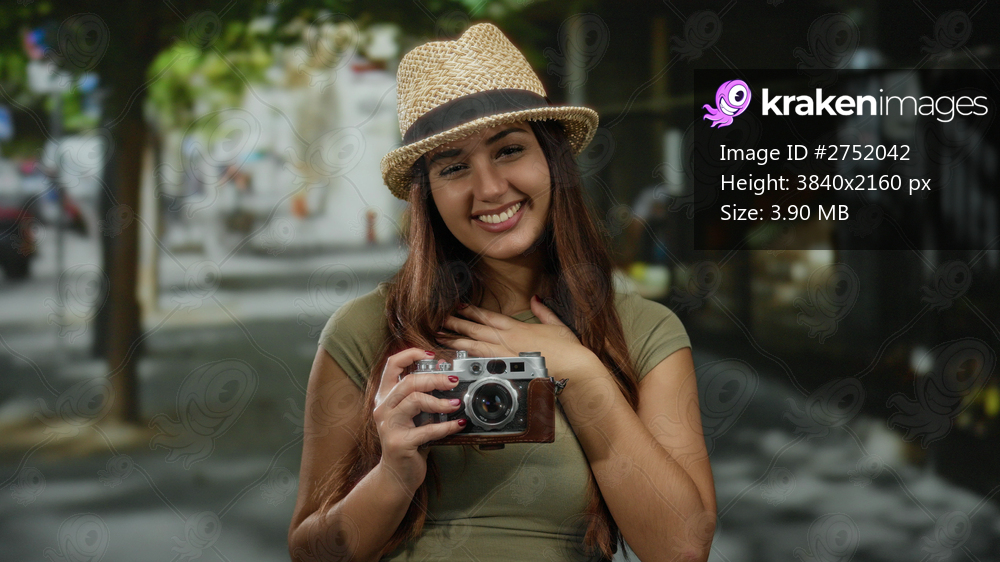 Woman smiling outdoors wearing a hat holding a vintage camera on a sunny street exuding joy and capturing travel memories in an urban environment.