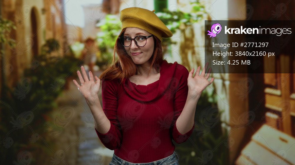 Woman smiling outdoors wearing beret and glasses on city street with blurred background