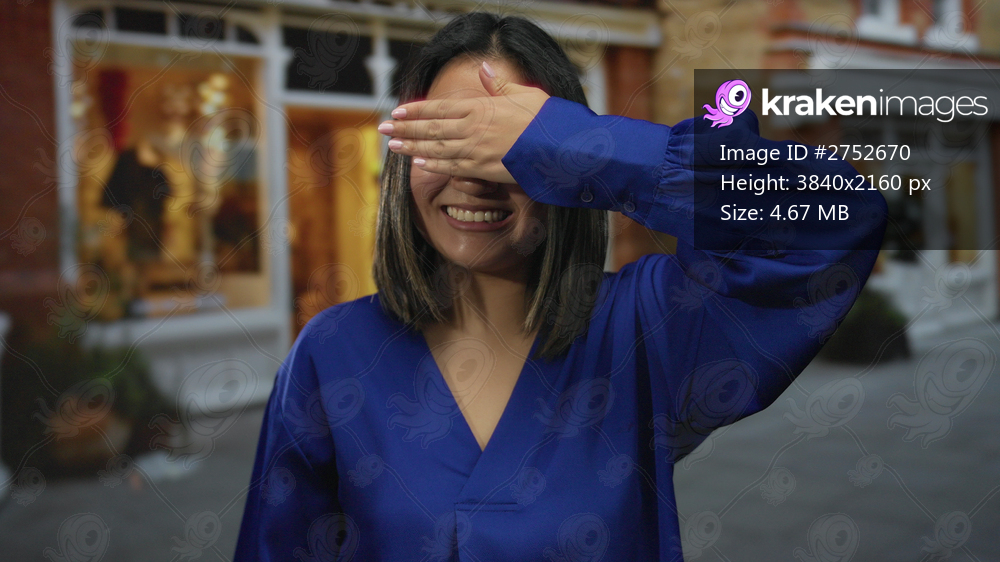 Woman smiling outdoors wearing blue blouse in urban street setting with vibrant cityscape background creating a lively and engaging atmosphere showcasing youthful energy in action. - Kraken Images