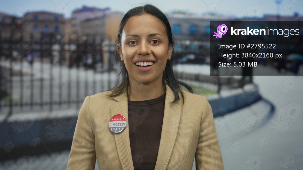 Woman smiling outdoors wearing i voted badge, symbolizing civic engagement on a city street, with a focus on hispanic identity and american patriotism. - Kraken Images