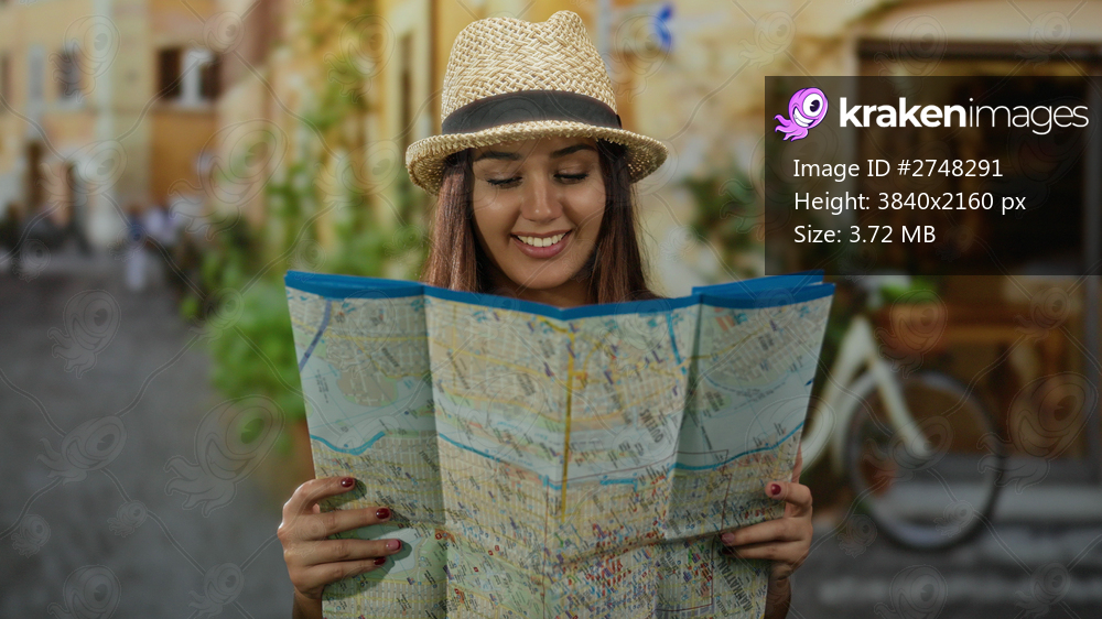 Woman smiling outdoors while reading a map on a sunny street, embodying the essence of travel and adventure as a tourist exploring new destinations.