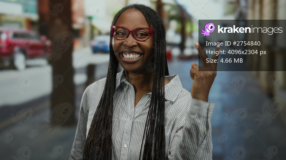 Woman smiling outside in urban street with red glasses curly hair against city backdrop showcasing joyful african american adult scene.