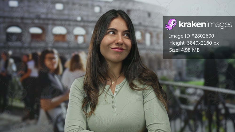 Woman smiling outside the roman coliseum with a cheerful demeanor amidst a lively crowd exploring the iconic ancient site in rome, showcasing travel and history. - Kraken Images