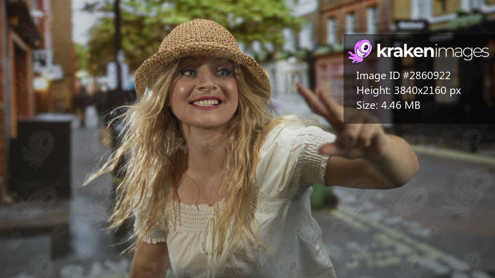 Woman smiling with outstretched hand showing peace sign on street wearing straw hat and white blouse; joy carefree celebration.