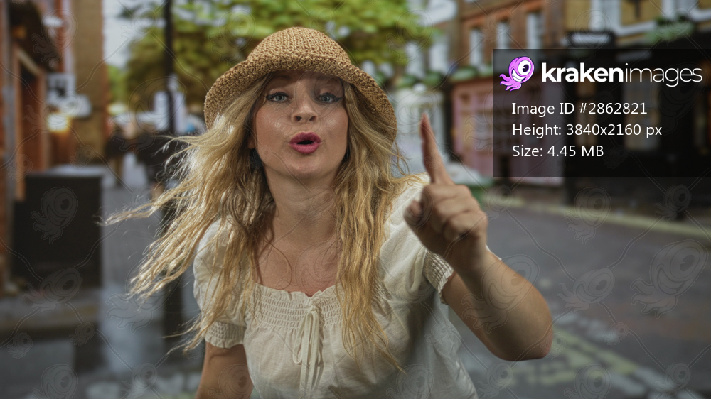 Woman smiling with outstretched hand showing peace sign on street wearing straw hat and white blouse; joy carefree celebration.