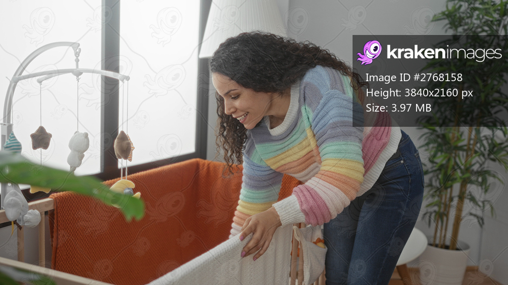 Woman smiling over a crib in a cozy bedroom with a colorful sweater and baby mobile, creating a warm, welcoming ambiance indoors, emphasizing a nurturing and joyful atmosphere. - Kraken Images
