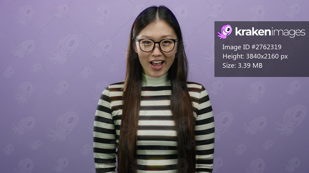 Woman smiling over an isolated purple background, wearing glasses and a striped shirt, showcasing a cheerful expression as she engages with the camera. - Kraken Images