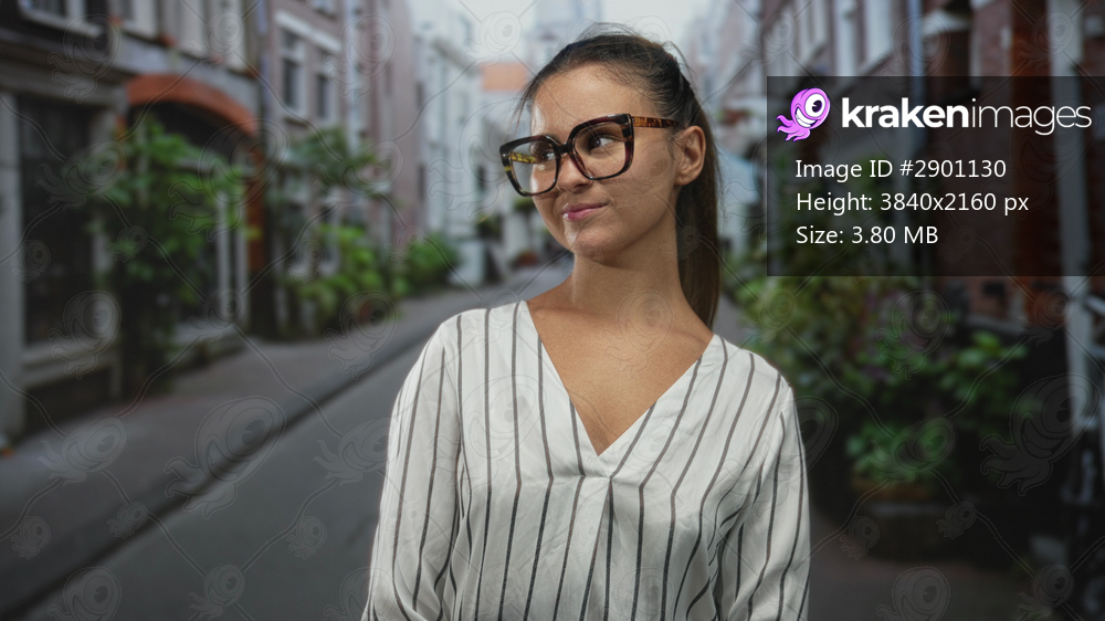 Woman smiling with oversized glasses and slight head tilt in narrow city street wearing striped blouse with visible collarbone and relaxed posture; urban confidence. - Kraken Images