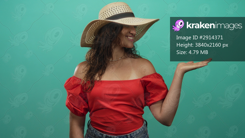 Woman smiling with palm up presenting, wearing straw sunhat and red off shoulder top in turquoise studio; cheerful summer travel.