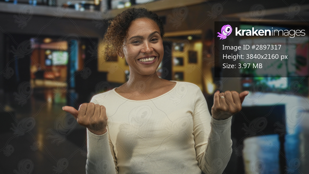 Woman smiling with palms up beckoning gesture in modern hotel building lobby; welcome hospitality warmth.