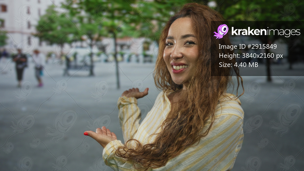 Woman smiling with palms up gesture on city street, long curly hair and striped yellow shirt, showing open hands and red nails; joy carefree.