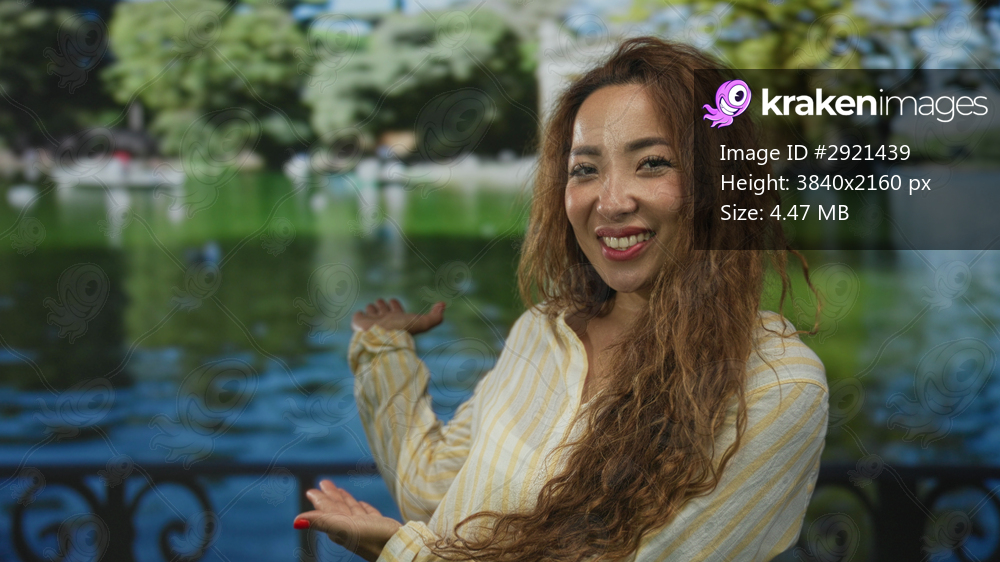 Woman smiling with palms up presenting a park lake and decorative railing in forest setting; serenity.