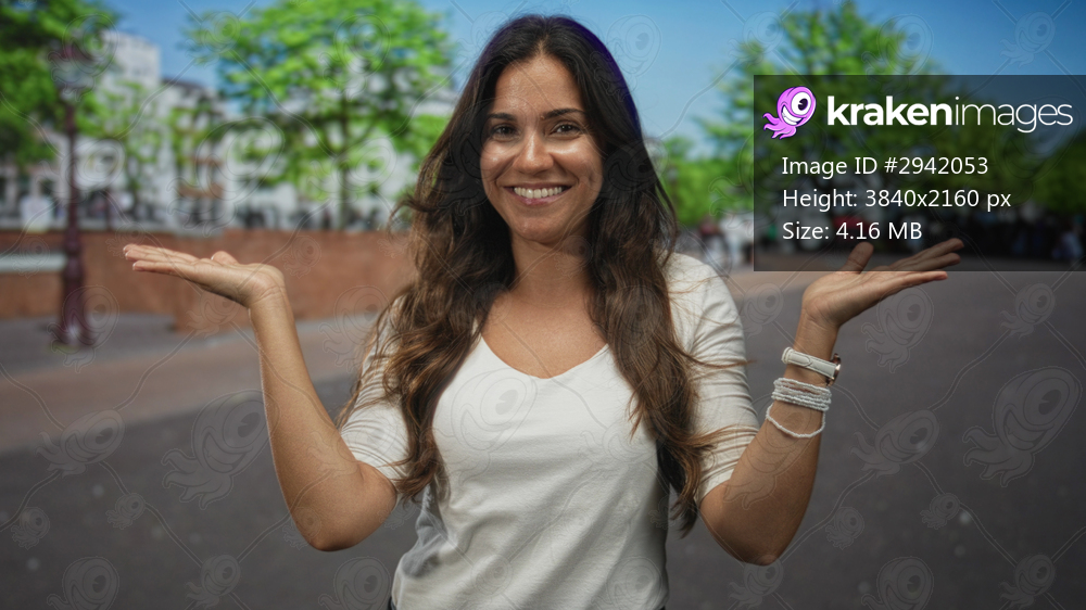 Woman smiling with palms up presenting on a busy city street wearing white shirt and bracelets; joy curiosity.