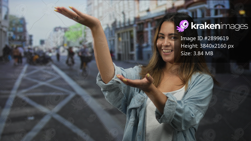 Woman smiling with palms up presenting on a busy street in the city, denim shirt and visible hands in frame; playful joy.