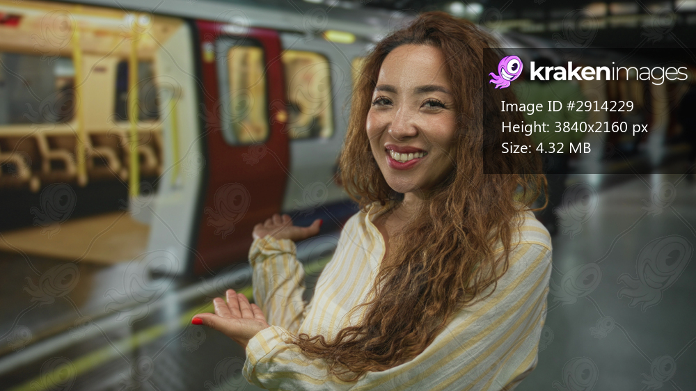 Woman smiling with palms up presenting train on underground platform building, wearing striped shirt; welcoming travel moment.
