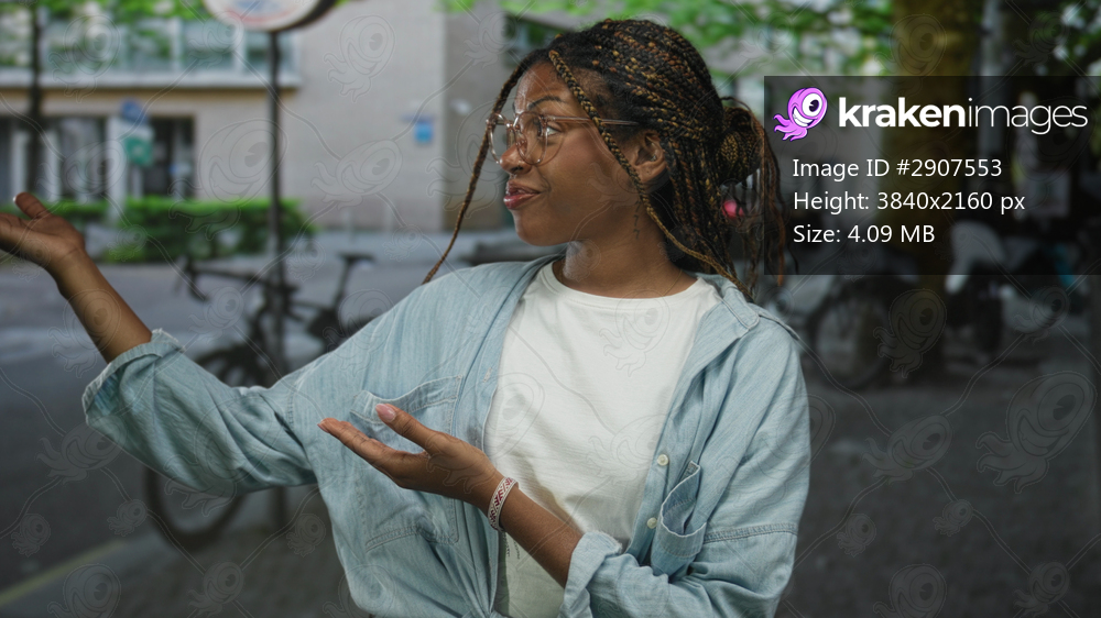 Woman smiling with palms up presenting, wearing glasses and braided hair on street with bicycles and tree in daylight; confidence optimism.