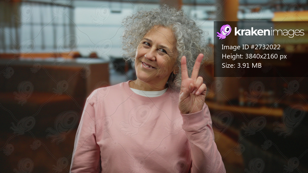 Woman smiling with peace sign in a cozy indoor restaurant setting, showcasing grey hair and casual attire.