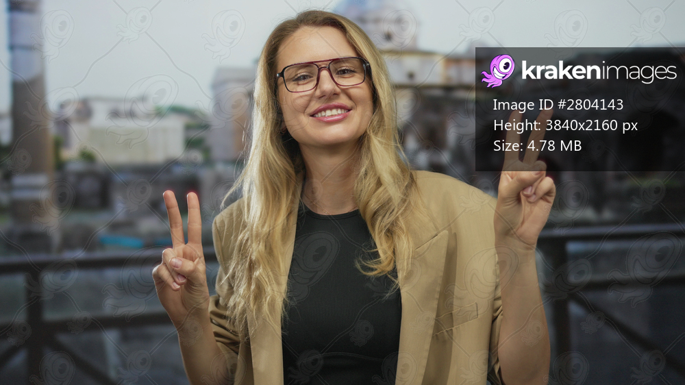Woman smiling with peace sign in roman ruins, wearing glasses and beige blazer, depicting carefree travel mood in historic architectural setting outdoors showcasing cultural heritage. - Kraken Images
