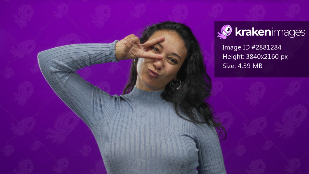 Woman smiling with peace sign to eye, visible hand raised in studio purple backdrop, long dark hair and ribbed sweater; playful.