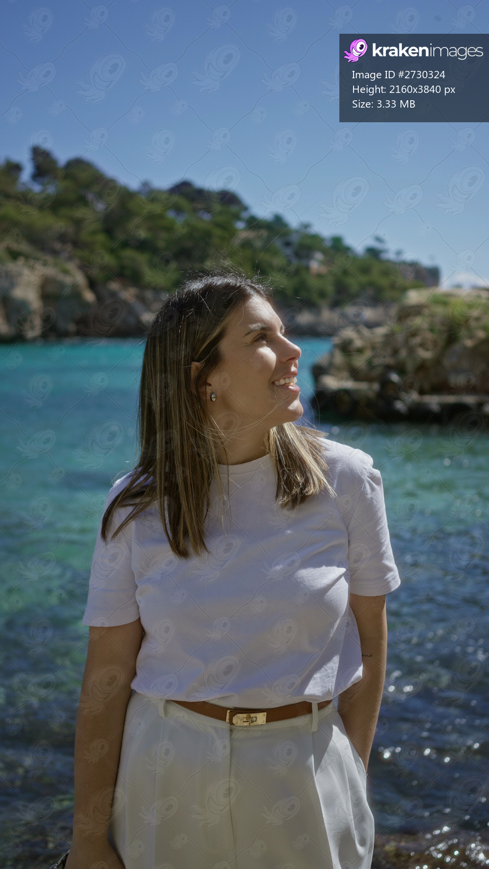 Woman smiling peacefully by the mediterranean on a sunny day in santanyi, mallorca with turquoise waters and lush greenery in the background.