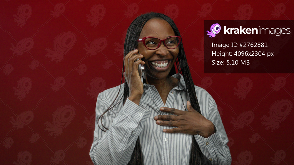 Woman smiling with phone against vibrant red background, wearing glasses and a striped shirt, showcasing joy in communication