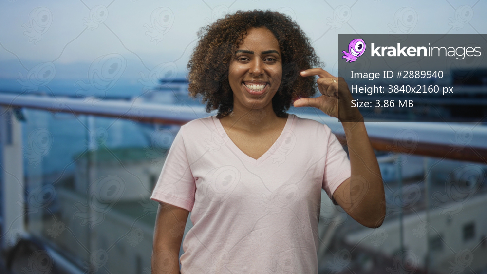 Woman smiling pinches small gap with fingers on cruise ship deck building while wearing pink vneck tshirt and ring; vacation joy.