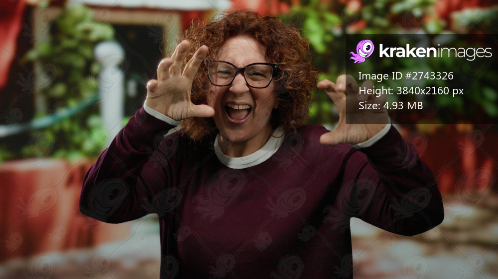 Woman smiling and playful on a vibrant city street with lush greenery and a red building facade in the background.
