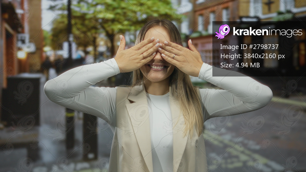 Woman smiling playfully covering her eyes in a vibrant city street setting, exuding joy and a carefree attitude, captured outdoors in an urban environment for a fun lifestyle concept. - Kraken Images