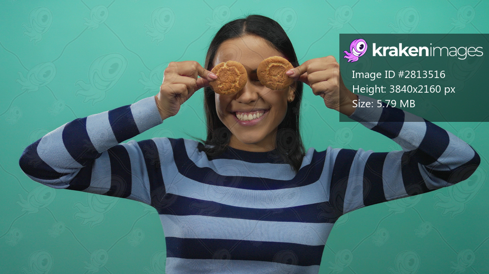 Woman smiling playfully holding cookies over eyes against vibrant green background wearing striped sweater showing fun and lighthearted expression in isolated scene - Kraken Images