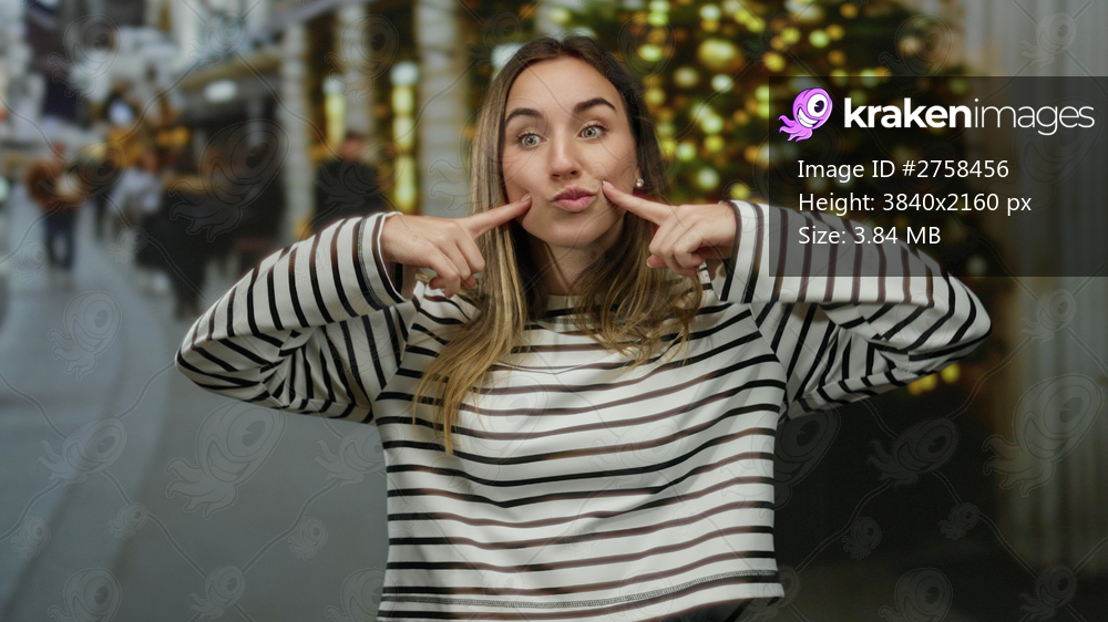 Woman smiling playfully in a striped shirt outdoors with a festive background of lights on a bustling street capturing joyful moments.