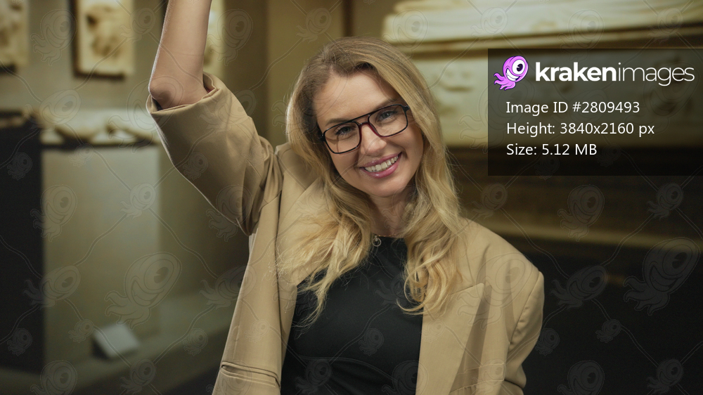 Woman smiling playfully indoors at a museum with blonde hair, covering eyes with hand, enjoying a lively moment and wearing casual attire.