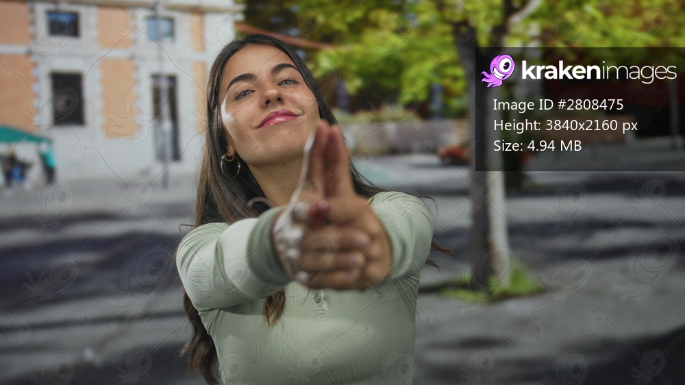 Woman smiling playfully pointing fingers like a gun in the street surrounded by trees on a sunny day outdoors.