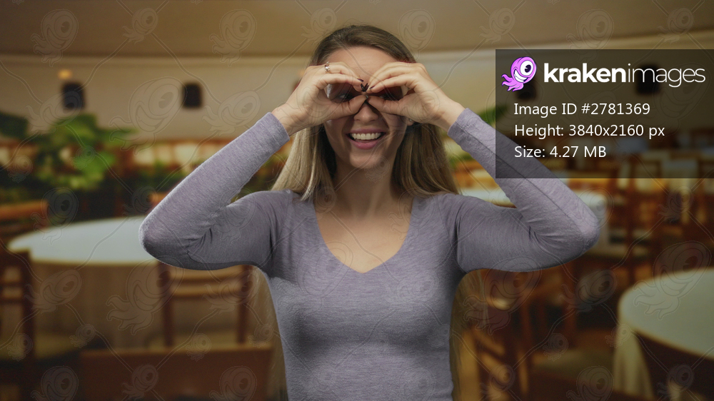 Woman smiling playfully while mimicking binoculars with hands in a cozy restaurant setting, highlighting her youthful caucasian features and the inviting indoor atmosphere. - Kraken Images