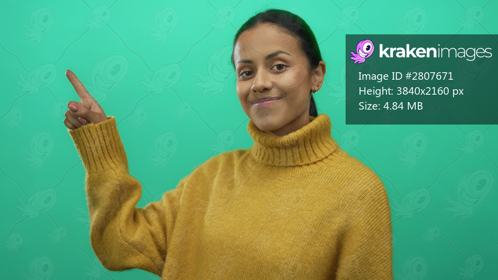 Woman smiling and pointing ahead in a casual yellow sweater against an isolated green background wall, showcasing a positive and thoughtful expression. - Kraken Images