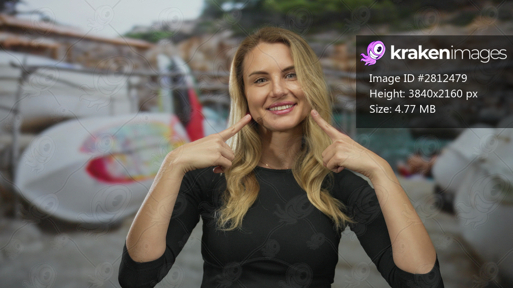 Woman smiling and pointing at her cheeks with both hands, standing on a sandy beach with boats in the background on a sunny day.