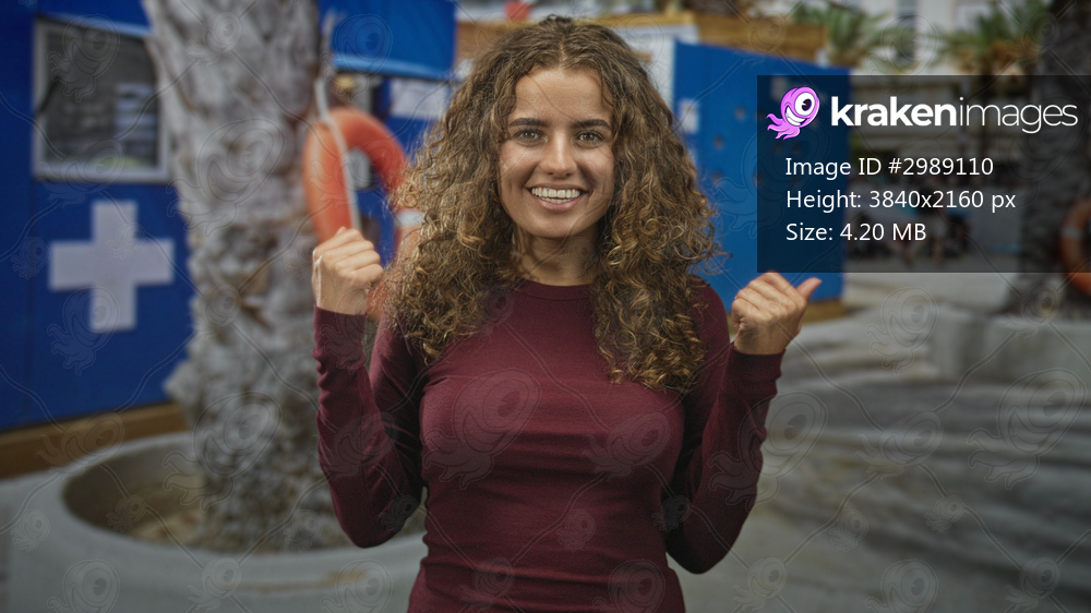 Woman smiling and pointing both thumbs at herself while standing by an orange lifebuoy and blue rescue hut on a street with palm trees and beachgoers; joy confidence. - Kraken Images