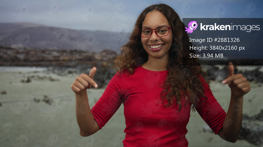 Woman smiling and pointing both thumbs down at beach shoreline, curly hair visible, wearing red shirt and red glasses; confidence.
