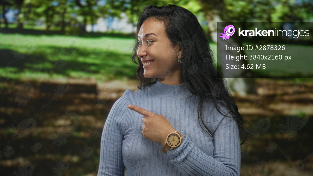 Woman smiling and pointing finger at a tree in a bright forest park with green grass and a bench, wearing blue turtleneck sweater, hoop earrings and wooden watch; joy warmth. - Kraken Images