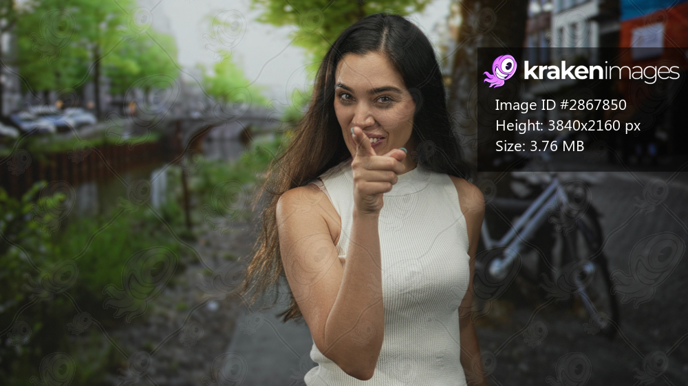 Woman smiling and pointing finger at camera on a busy canal street by the water with bicycle in view; confidence.