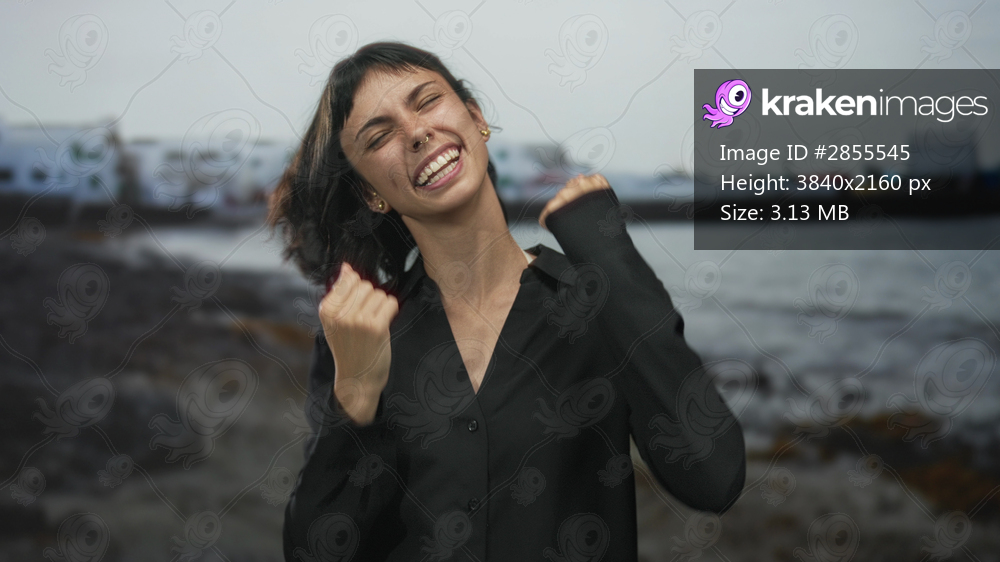 Woman smiling and pointing finger at camera on rocky beach shoreline; confidence strength determination.