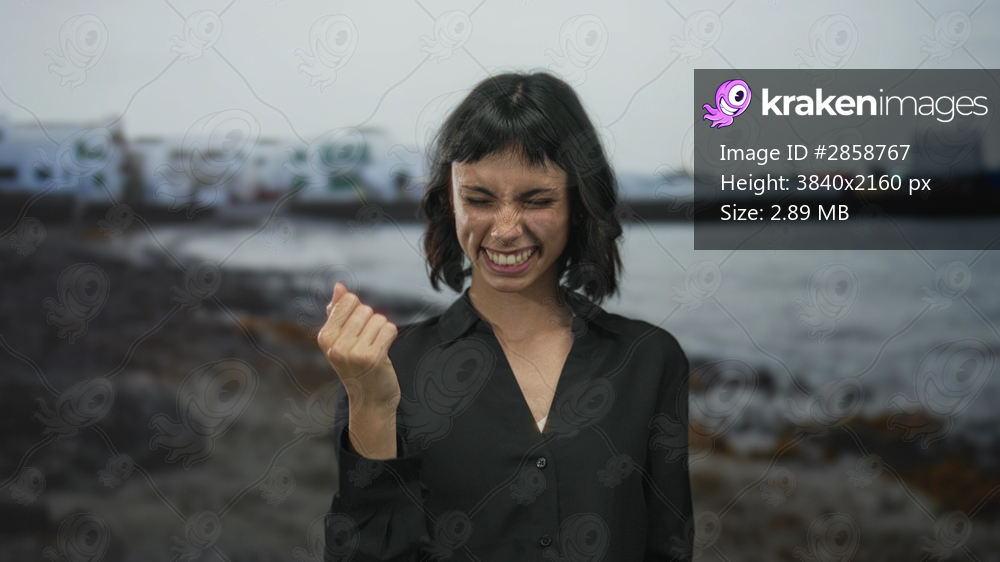 Woman smiling and pointing finger at camera on rocky beach shoreline; confidence strength determination.