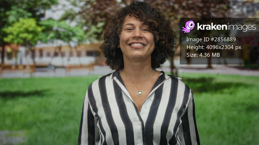 Woman smiling and pointing finger at pendant on striped blouse in green park; confidence joy.