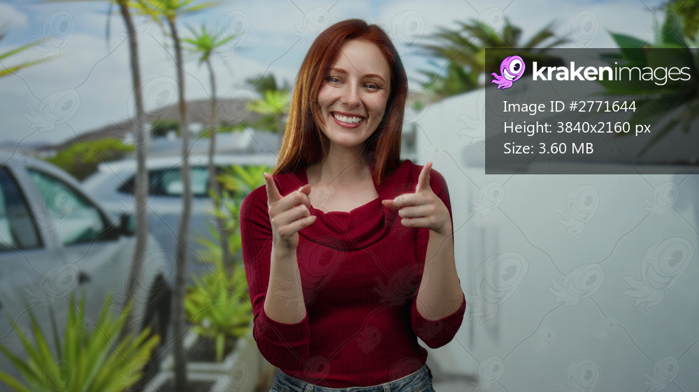 Woman smiling and pointing finger outdoors in a sunny urban street with greenery and cars, showcasing her red hair and wearing a stylish red top, embodying confidence and charm. - Kraken Images