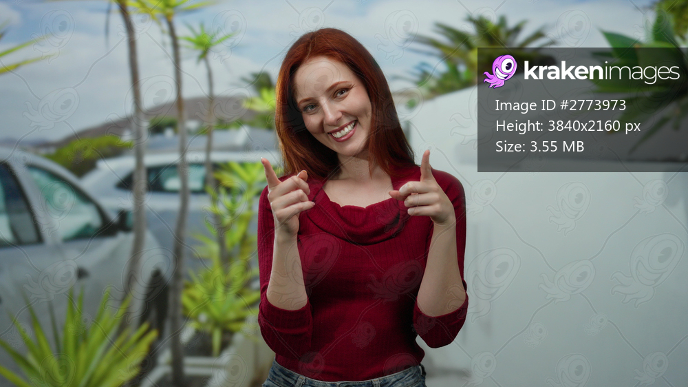 Woman smiling and pointing finger outdoors in a sunny urban street with greenery and cars, showcasing her red hair and wearing a stylish red top, embodying confidence and charm. - Kraken Images