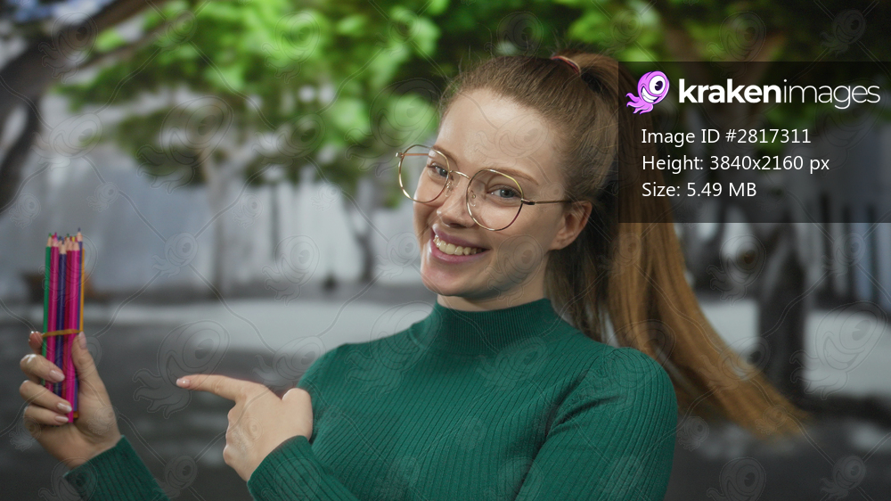 Woman smiling and pointing finger to a bundle of colored pencils held in hand on city street; creativity.