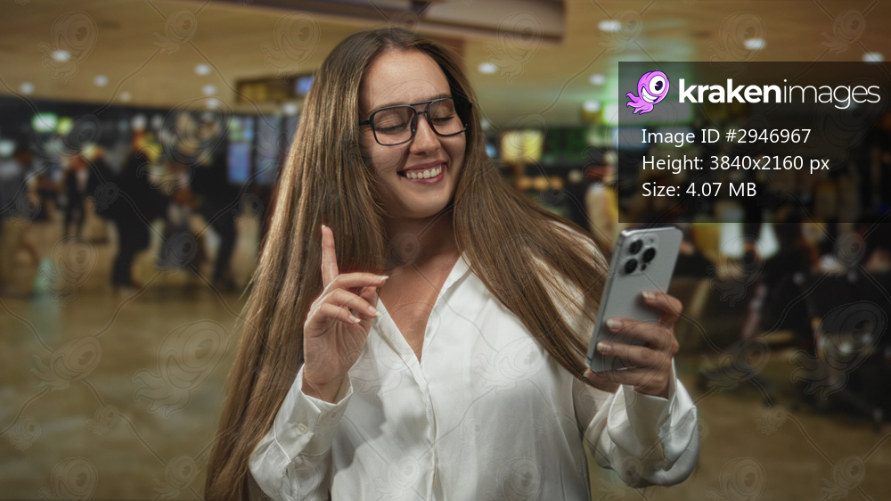 Woman smiling and pointing finger to phone while holding smartphone in busy airport terminal, wearing glasses and white shirt; joy travel optimism.