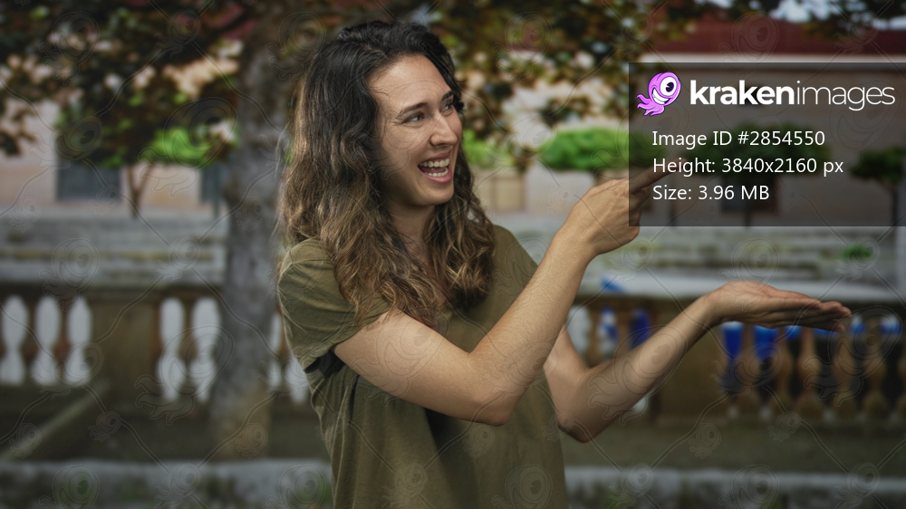 Woman smiling and pointing finger to side in bright daylight on street with building facade visible; joy.